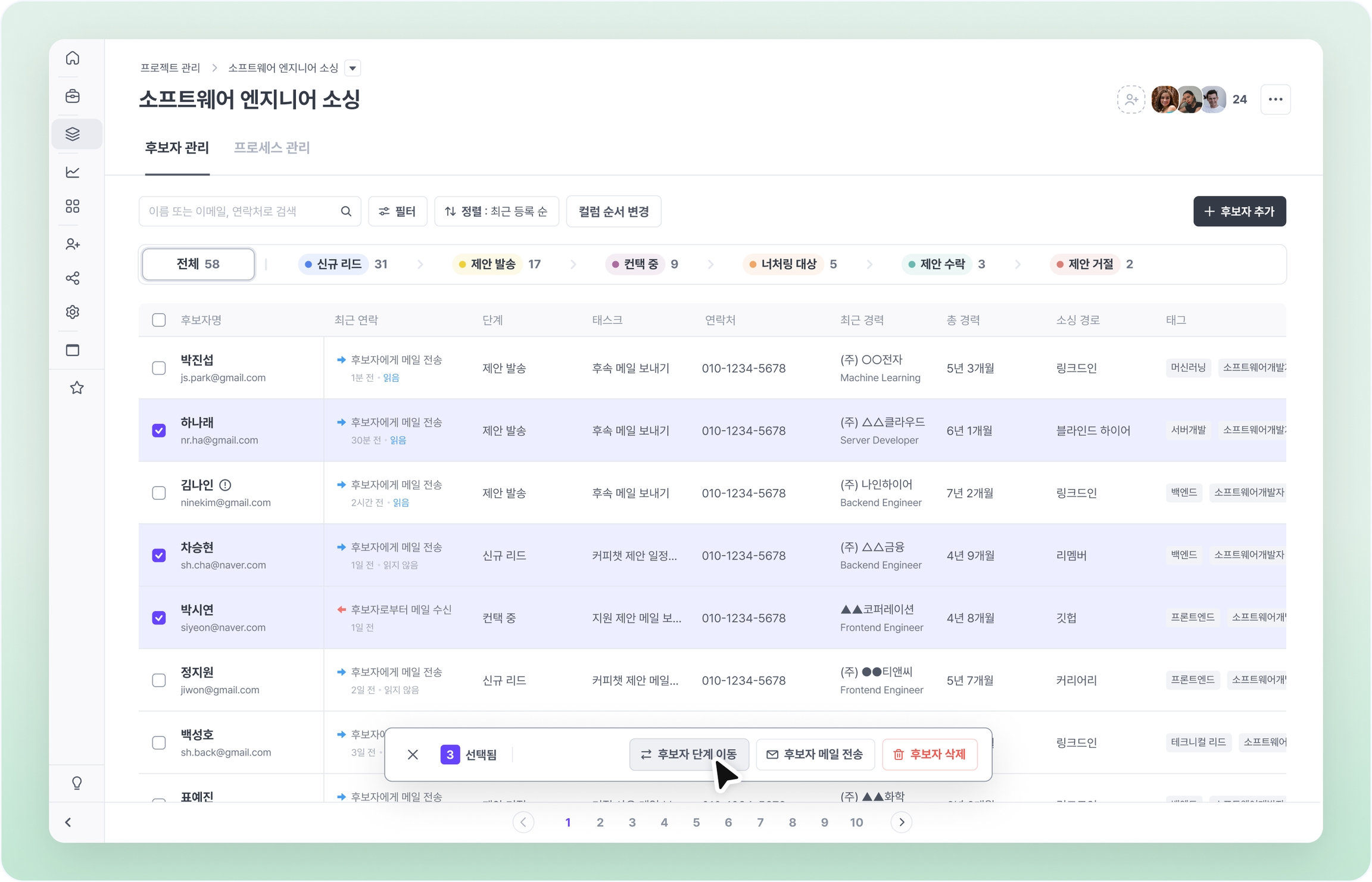 프로젝트별 모든 후보자의 정보와 실시간 상태를 한눈에 파악하고, 한 번에 관리하여 업무 생산성을 크게 높이세요. 필터를 통해 특정 정보에 부합하는 후보자를 빠르게 찾고, 후보자 다중 선택(벌크 액션)을 통해 다수의 후보자를 일괄 처리할 수도 있어요.