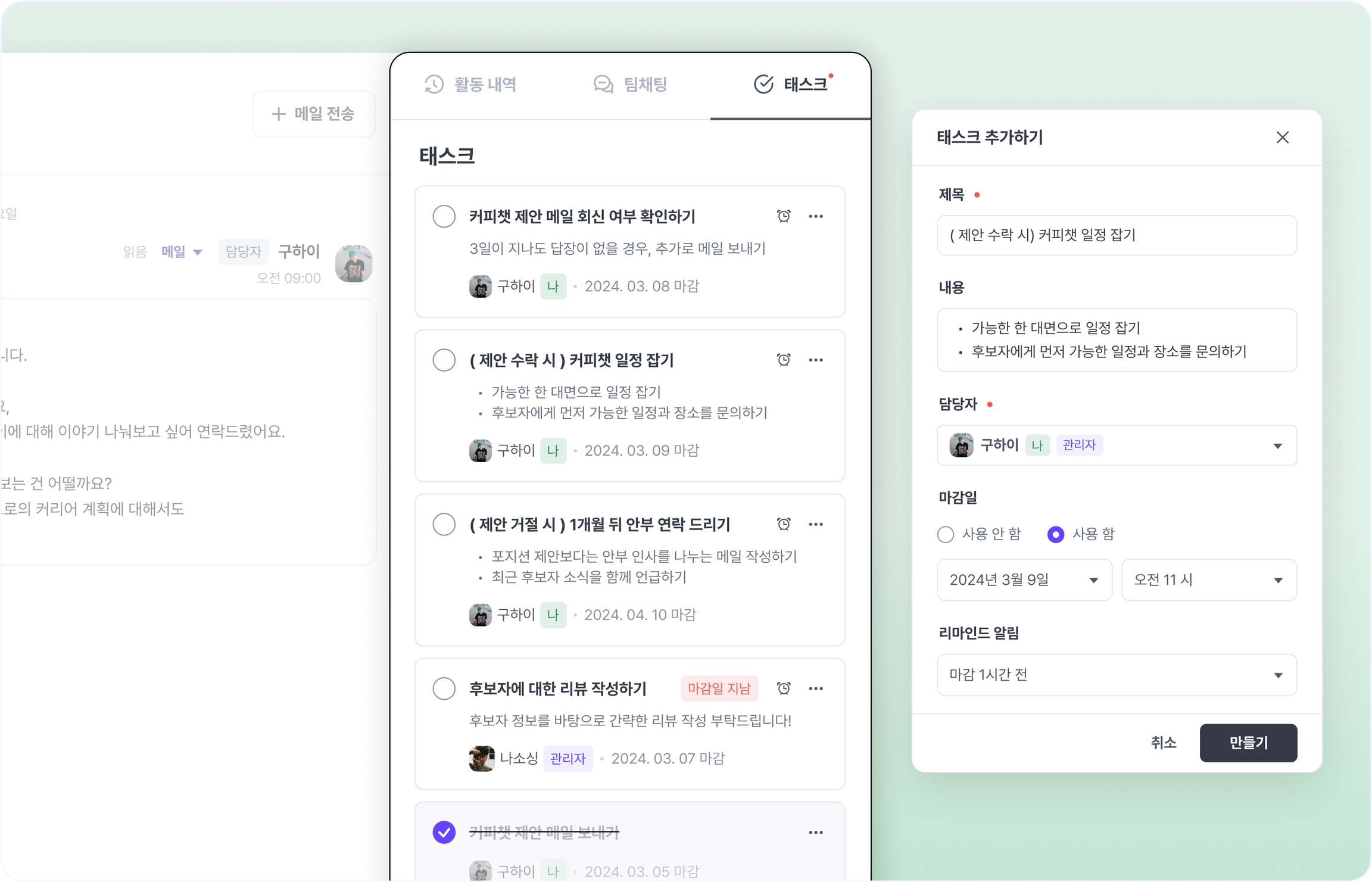 후보자와 지속적으로 관계를 유지하기 위한 업무를 태스크로 설정하여 체계적으로 관리해 보세요. 정기적인 연락을 위한 태스크를 생성하고, 체크리스트와 마감일을 활용하여 업무 진행 상황을 관리할 수 있습니다. 마감일이 다가오는 태스크를 놓치지 않도록 리마인드 알림도 활용해 보세요.