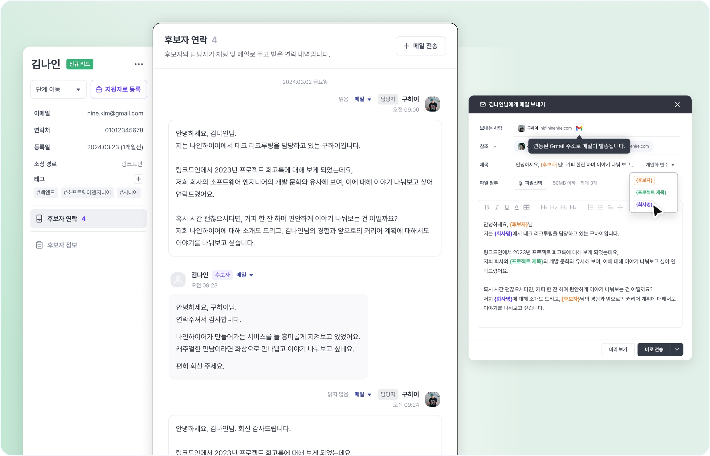 이제 모든 커뮤니케이션을 한 곳에서 관리하며, 후보자와 효과적으로 소통해 보세요. 개인화 변수를 활용해 메일을 쉽게 작성하고 전송할 수 있으며, 후보자가 메일을 열람했는지 여부도 확인 가능합니다. Gmail을 연동하면, 외부에서 후보자와 주고받은 메일 내역도 나인하이어에서 확인할 수 있습니다.
