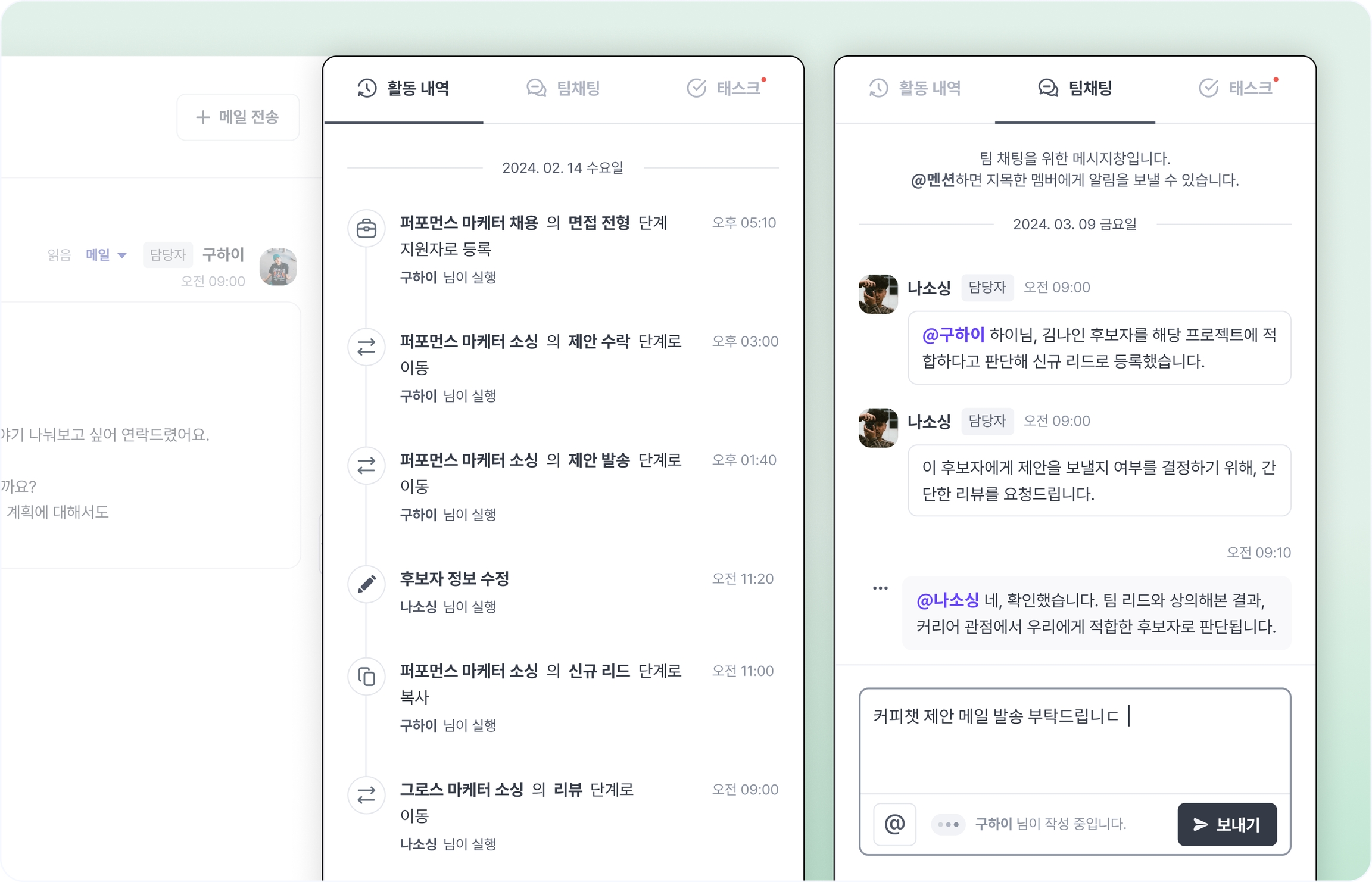 후보자에 대한 정보를 실시간으로 공유하거나 리뷰을 남기고, 멘션(@)을 통해 빠르게 피드백을 요청할 수 있습니다.