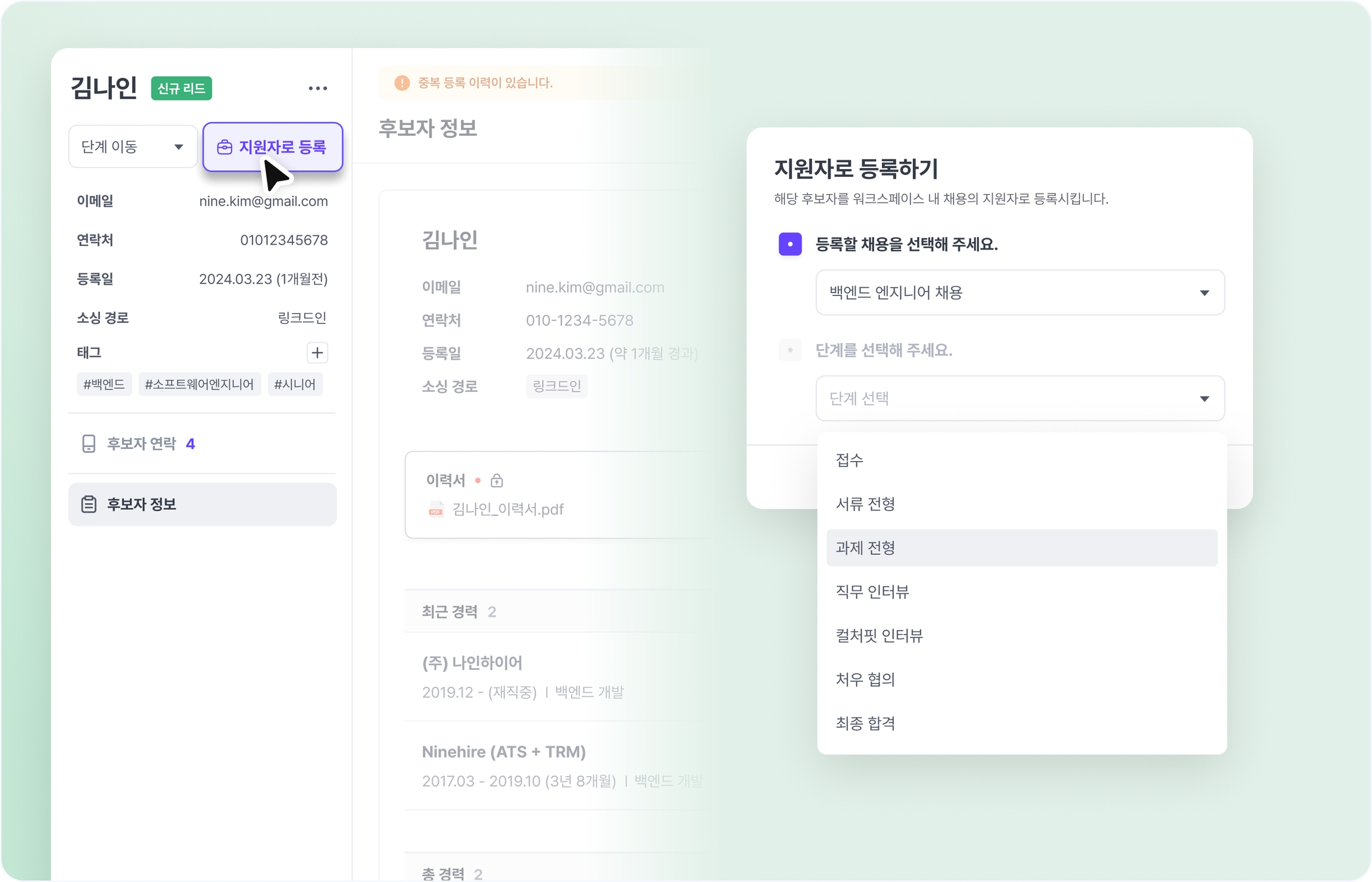 제안을 받아들인 후보자를 나인하이어에서 진행 중인 채용의 지원자로 간편하게 등록할 수 있어요. 후보자의 개인정보, 지원서류, 경력사항 등의 데이터는 자동으로 지원자의 정보에 업데이트됩니다.
