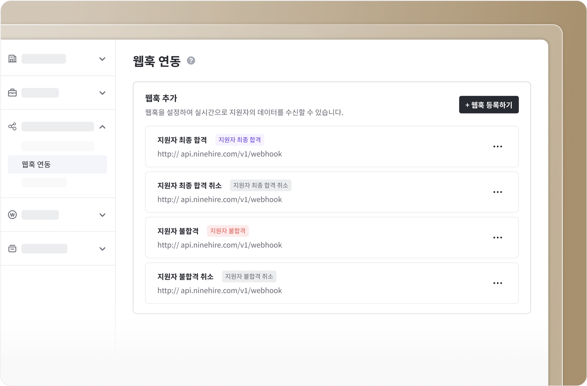 웹훅 등록을 통해 나인하이어에서 지원자 데이터가 변경되었을 때, 서버에서 실시간으로 지원자의 데이터를 수신할 수 있어요. 나인하이어에 등록된 지원자가 최종 합격 또는 불합격 시 지원자의 데이터를 사내 인사 관리 ERP에 등록하여 활용해 보세요.