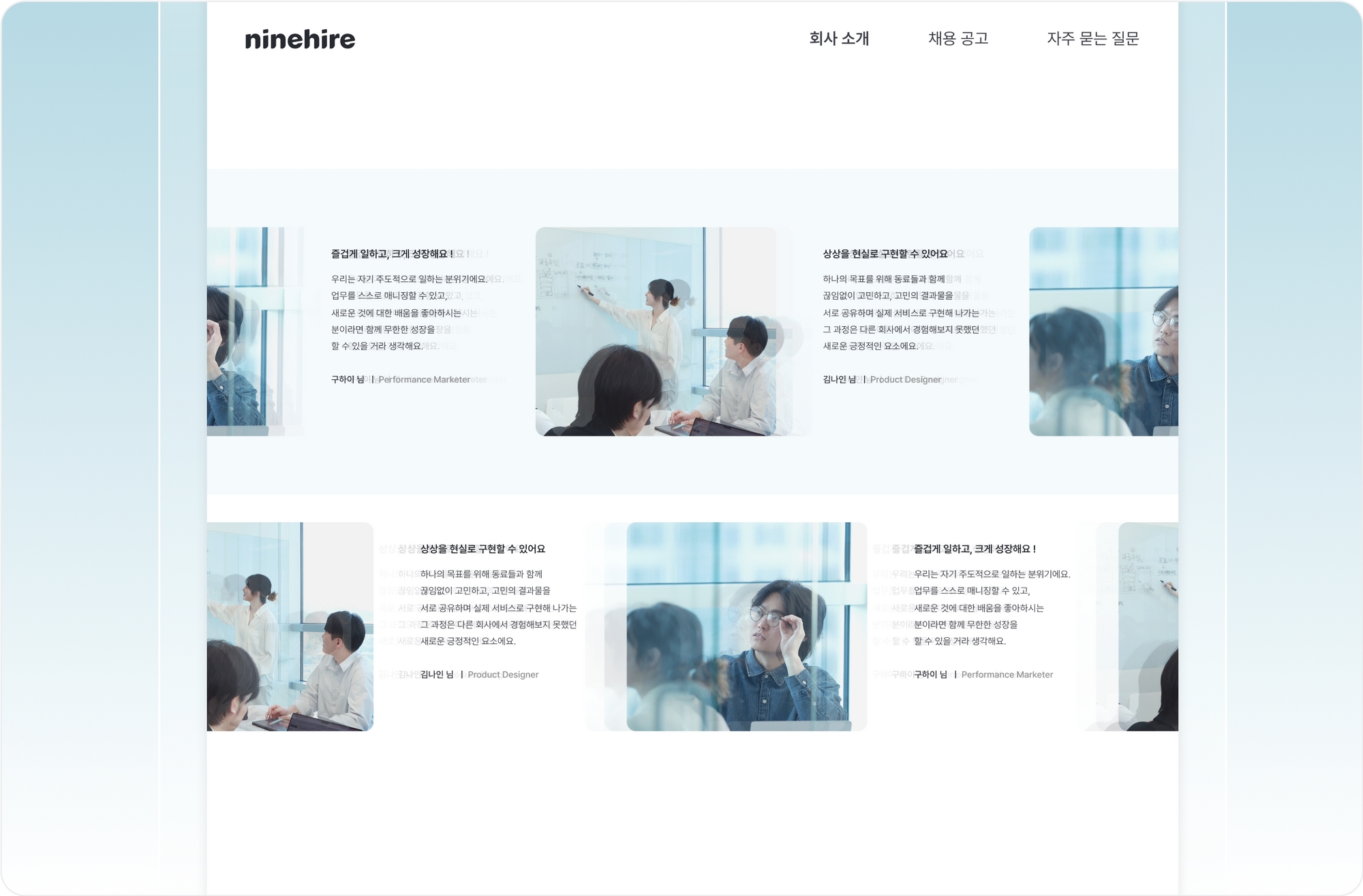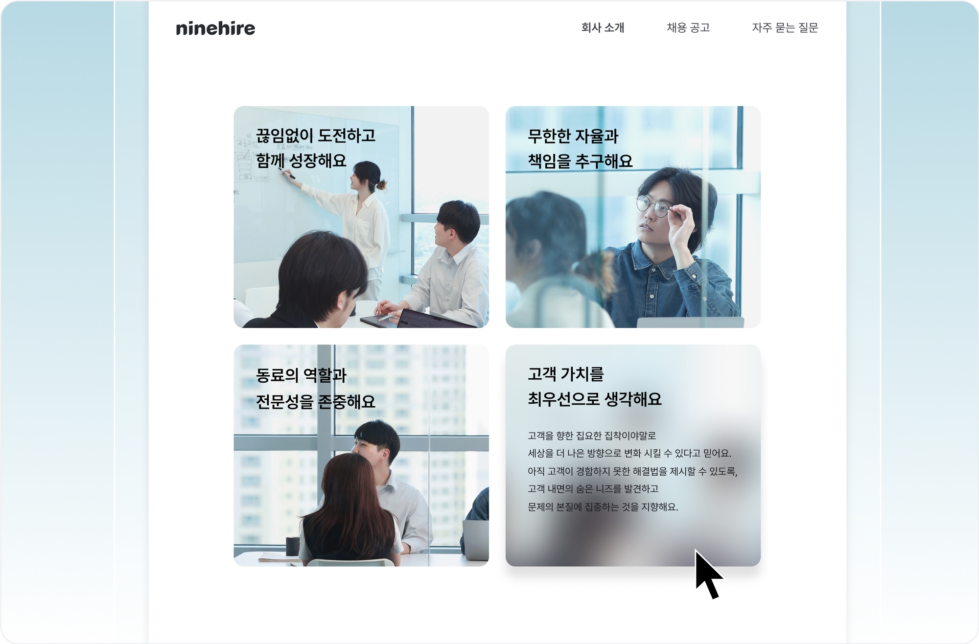 나인하이어의 채용 홈페이지 빌더는 계속해서 고도화되고 있습니다. 지원자가 알고 싶어하고 필요로 하는 정보를 다양한 구성과 디자인의 콘텐츠로 제작해 보세요. 여러분의 채용 홈페이지가 구직 목록 그 이상, 채용 브랜딩을 위한 가장 좋은 채널이자 기회가 될 거에요.
