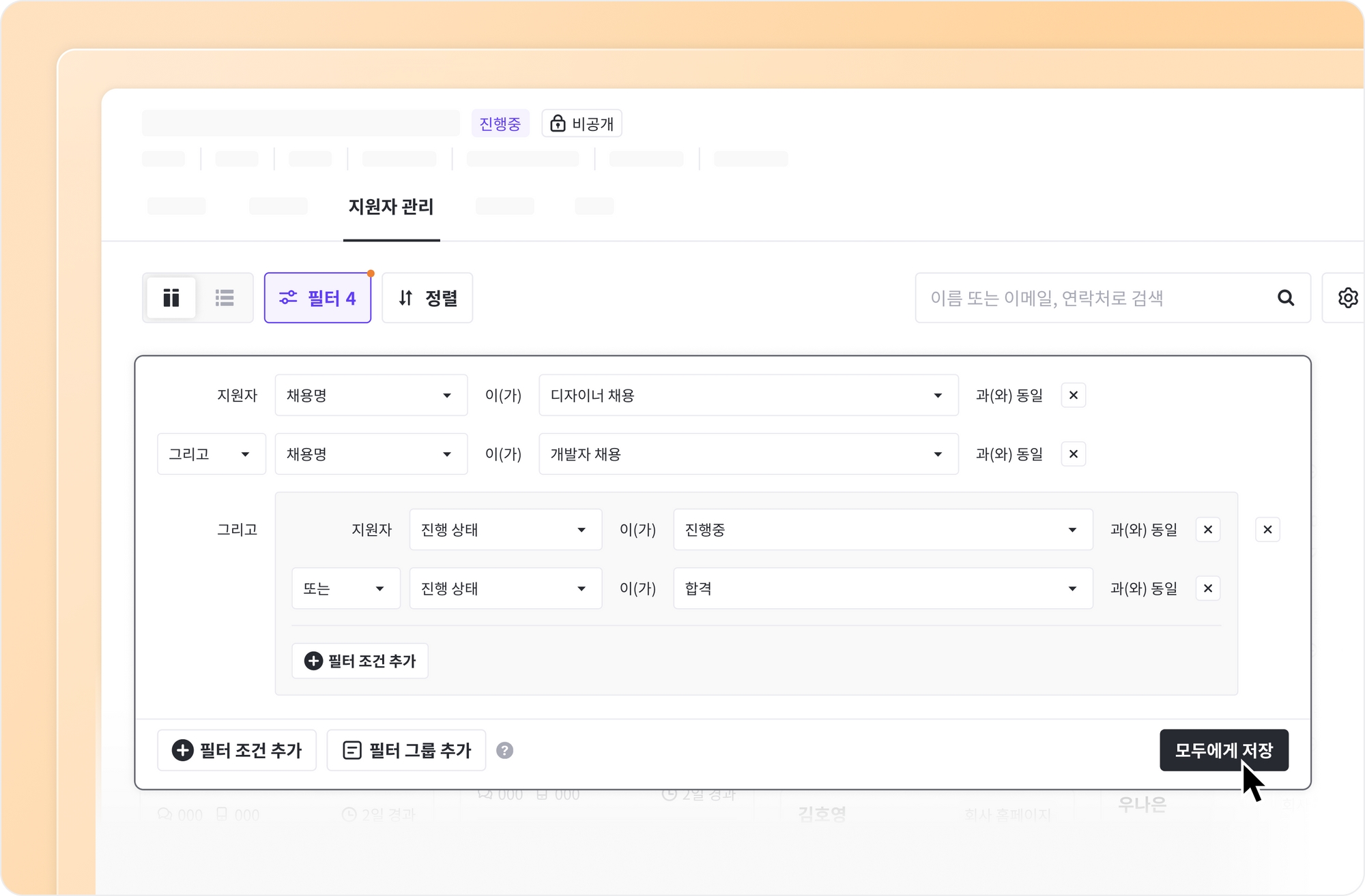 지원자 칸반 보드 또는 리스트에서 내가 설정한 필터를 모두에게 저장 하면 워크스페이스에 참여하는 사용자 모두에게 적용할 수 있어요. 워크스페이스에 공통으로 적용되는 필터 조건을 설정하여 모든 사용자와 동일한 뷰로 지원자를 관리해 보세요.