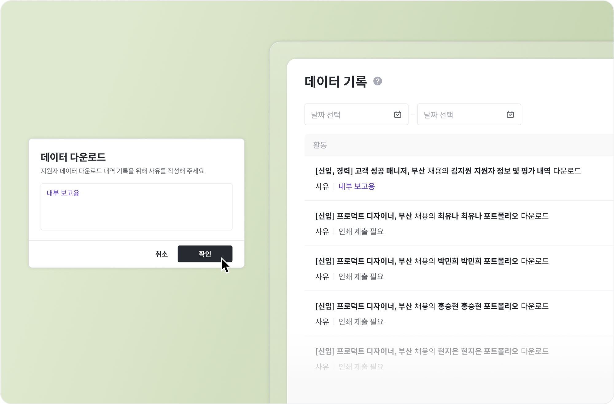 지원자의 정보는 중요하기에 투명한 환경에서 민감하게 다뤄져야 하죠. 개인 정보 보호를 강화하기 위해 지원자 리스트, 파일, 자료, 평가 내역 등의 모든 지원자 데이터를 다운로드 받을 때 사유를 작성해야 해요. 데이터를 다운로드 받은 활동, 날짜, 멤버, IP 등의 내역은 한 곳에 기록됩니다.