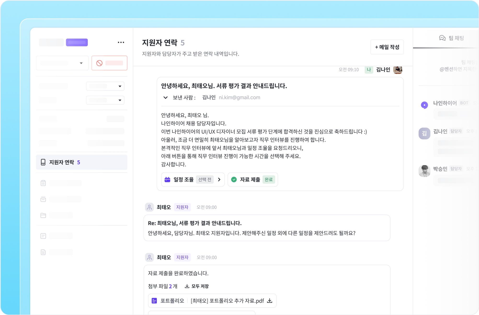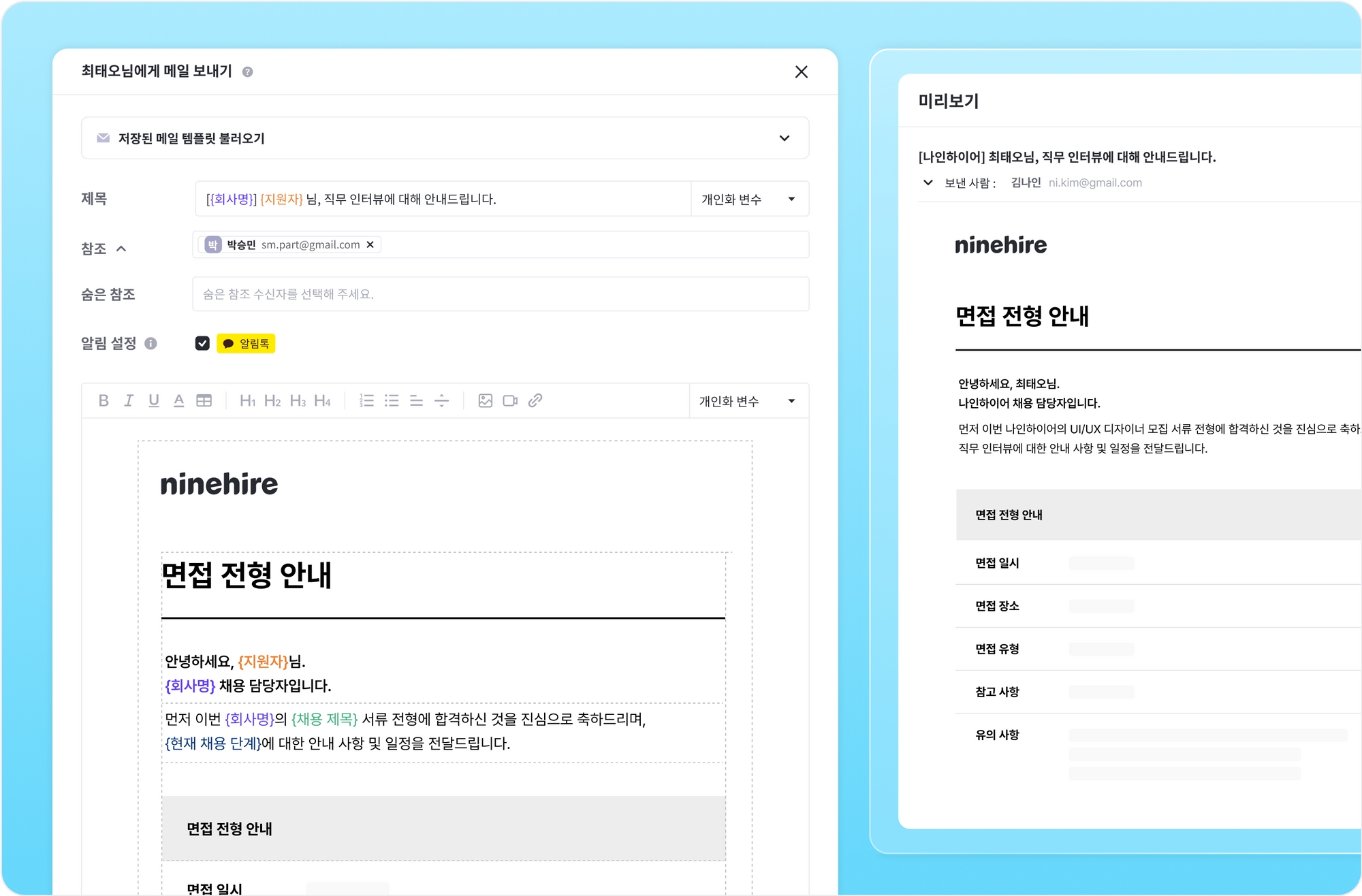 나인하이어를 통해 지원자와 보다 풍부한 콘텐츠가 담긴 메일을 주고 받고, 카카오 알림톡으로 알림을 전송할 수 있습니다. 기본으로 발송되는 메일의 제목을 작성하고 참조(숨은 참조) 수신자를 선택할 수 있으며, 안내 자료 등의 정해진 양식의 메시지를 전달할 수 있도록 에디터 기능이 추가되었어요. 그 외 템플릿, 개인화 변수, 파일 첨부, 일정 조율, 자료 요청하는 방법은 기존과 동일해요.