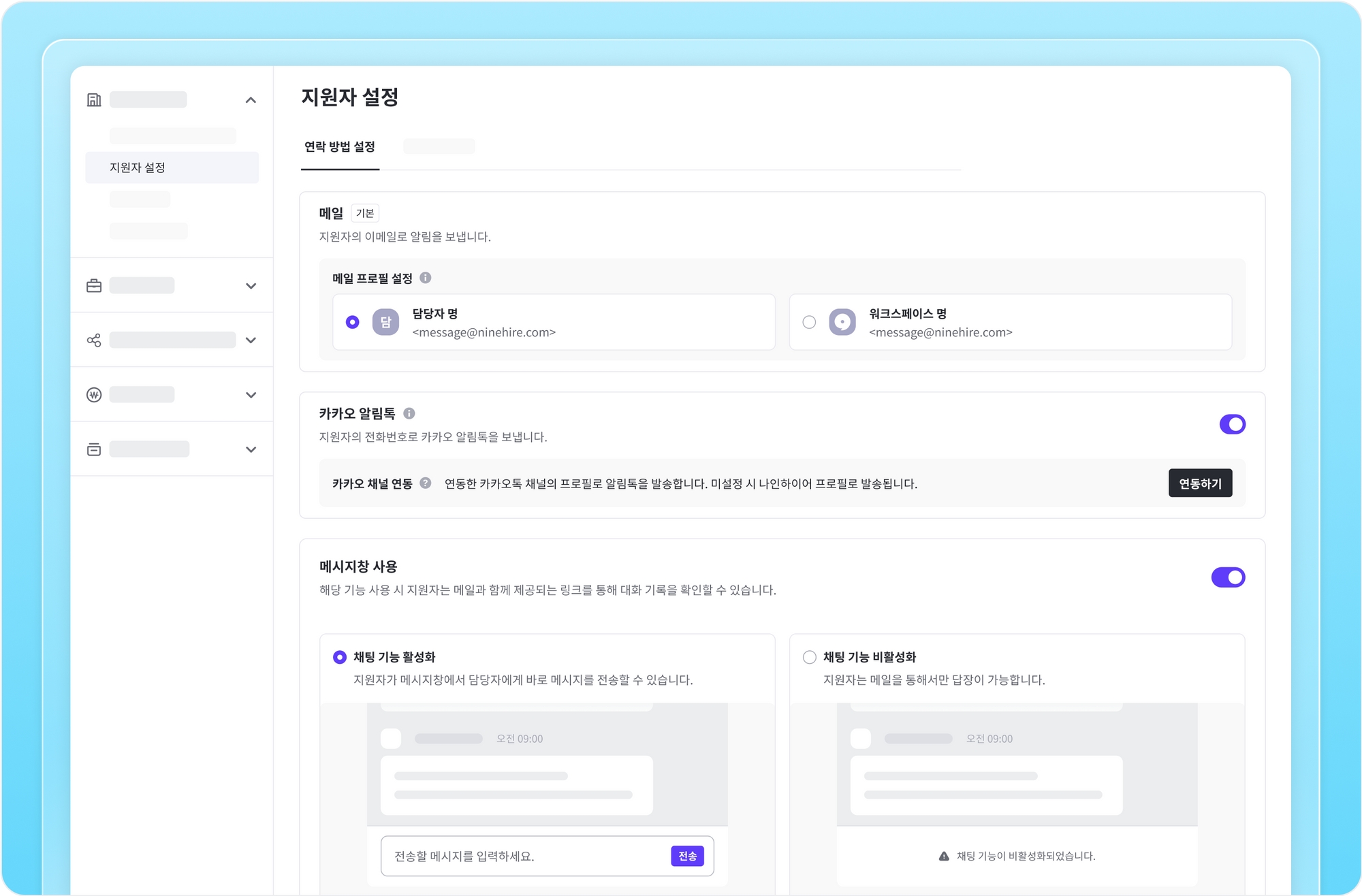 우리 회사의 채용 프로세스와 전략에 맞춰 지원자 연락 방법을 설정해 보세요. 공식적이고 격식을 갖춘 메시지는 메일을 통해서만 연락을 주고 받을 수 있도록 설정할 수 있으며, 보다 쉽고 빠른 커뮤니케이션이 중요하다면 기존의 채팅형 메시지창을 활용하여 지원자와 소통할 수도 있습니다.