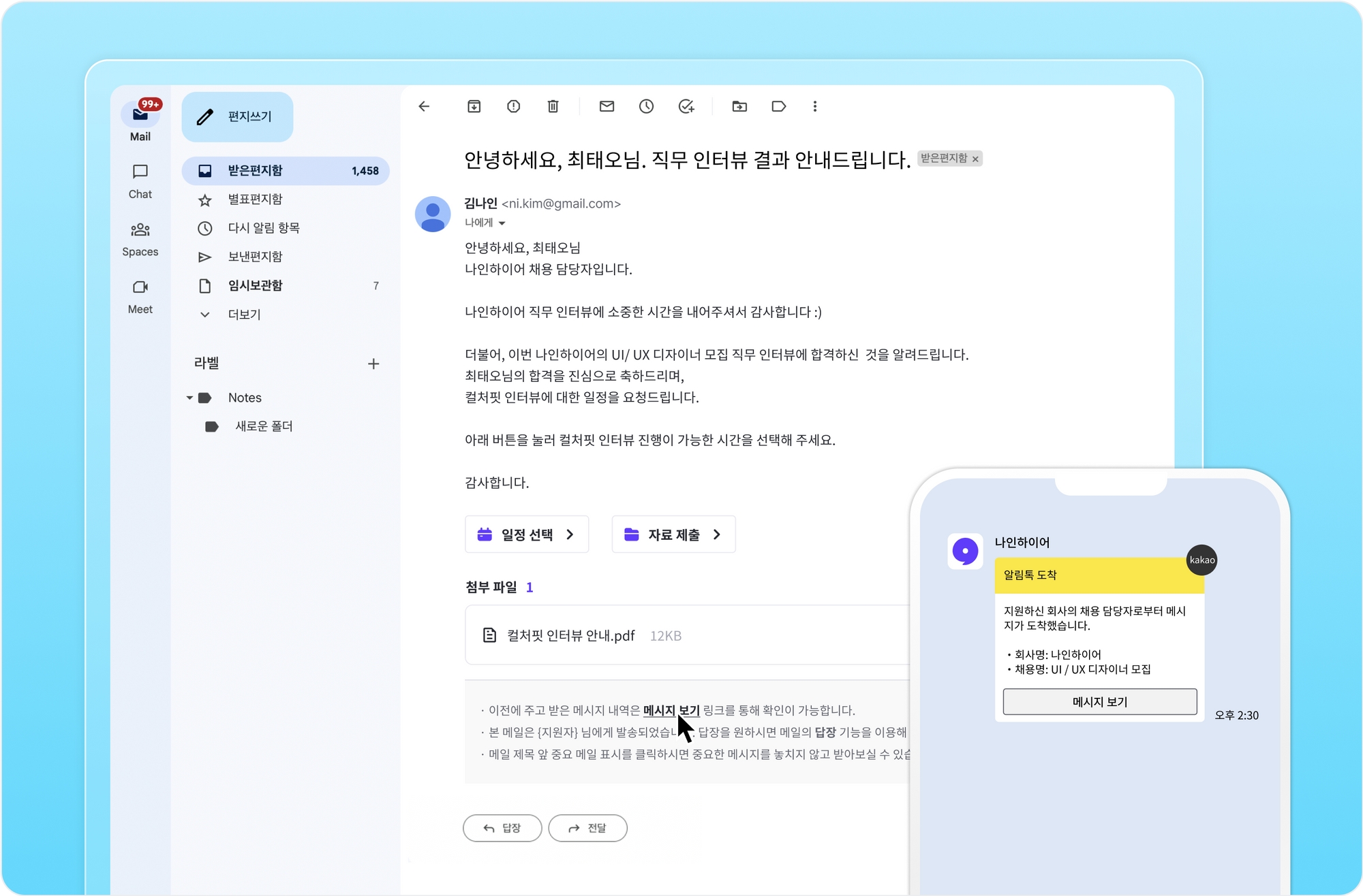 지원자는 작성하신 메시지 내용이 담긴 메일과, 알림 설정 시 카카오 알림톡으로 알림을 받습니다. 수신한 메일을 통해 바로 회신할 수 있고, 메시지창 사용 활성화 시 메일과 카카오 알림톡의 [메시지 보기] 버튼을 통해 메시지창으로 이동하여 대화 기록을 확인하고 회신할 수도 있어요.