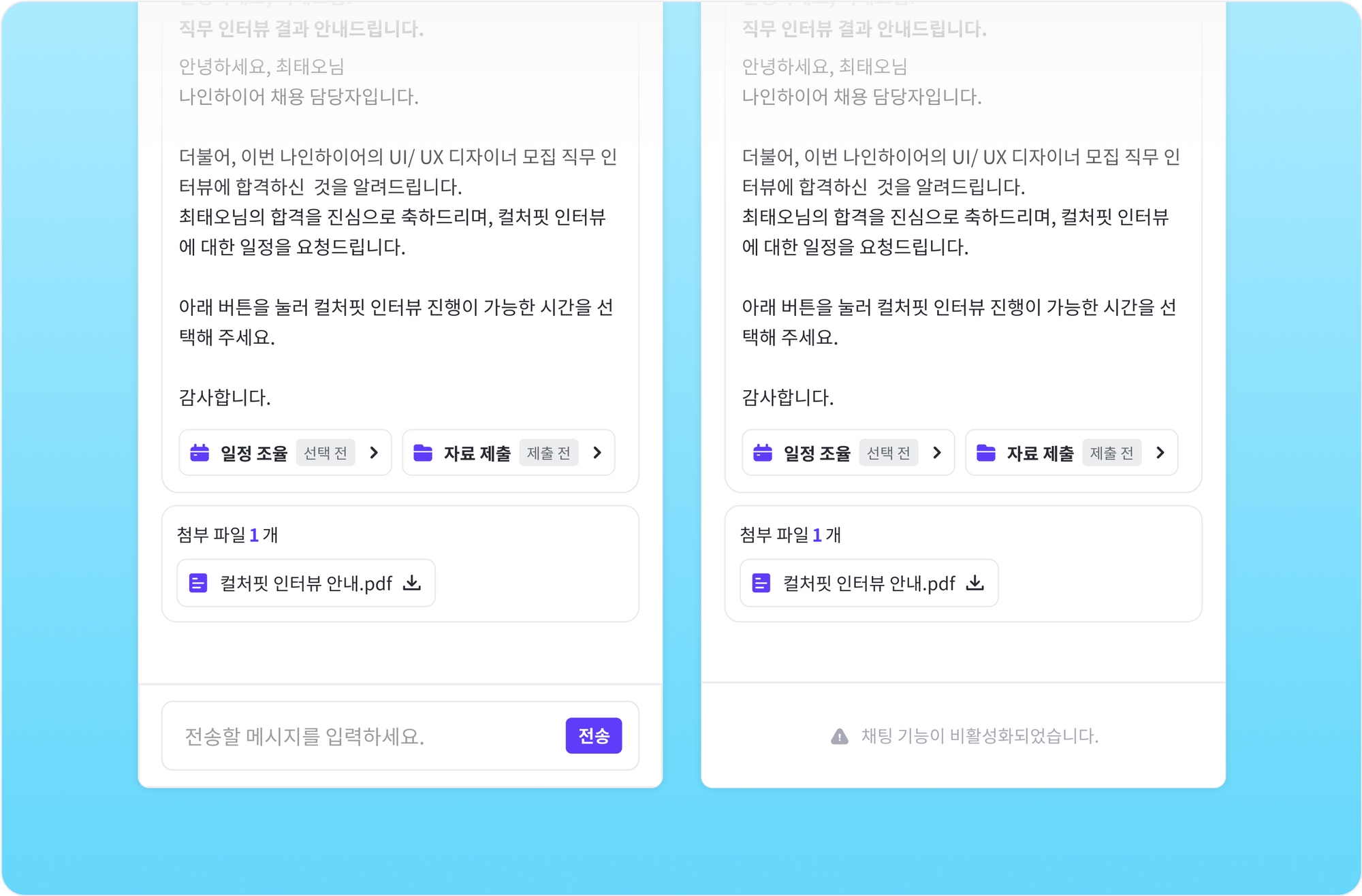 메시지창 사용 활성화 시 [메시지 보기] 버튼이 포함된 메일과 카카오 알림톡이 발송됩니다.이때 사전에 설정된 채팅 기능 활성화 여부에 따라 지원자의 채팅 기능이 제한됩니다. 채팅 기능 활성화 시 지원자는 메시지창을 통해 바로 회신할 수 있으며, 비활성화 시 메일을 통해서만 회신이 가능합니다.