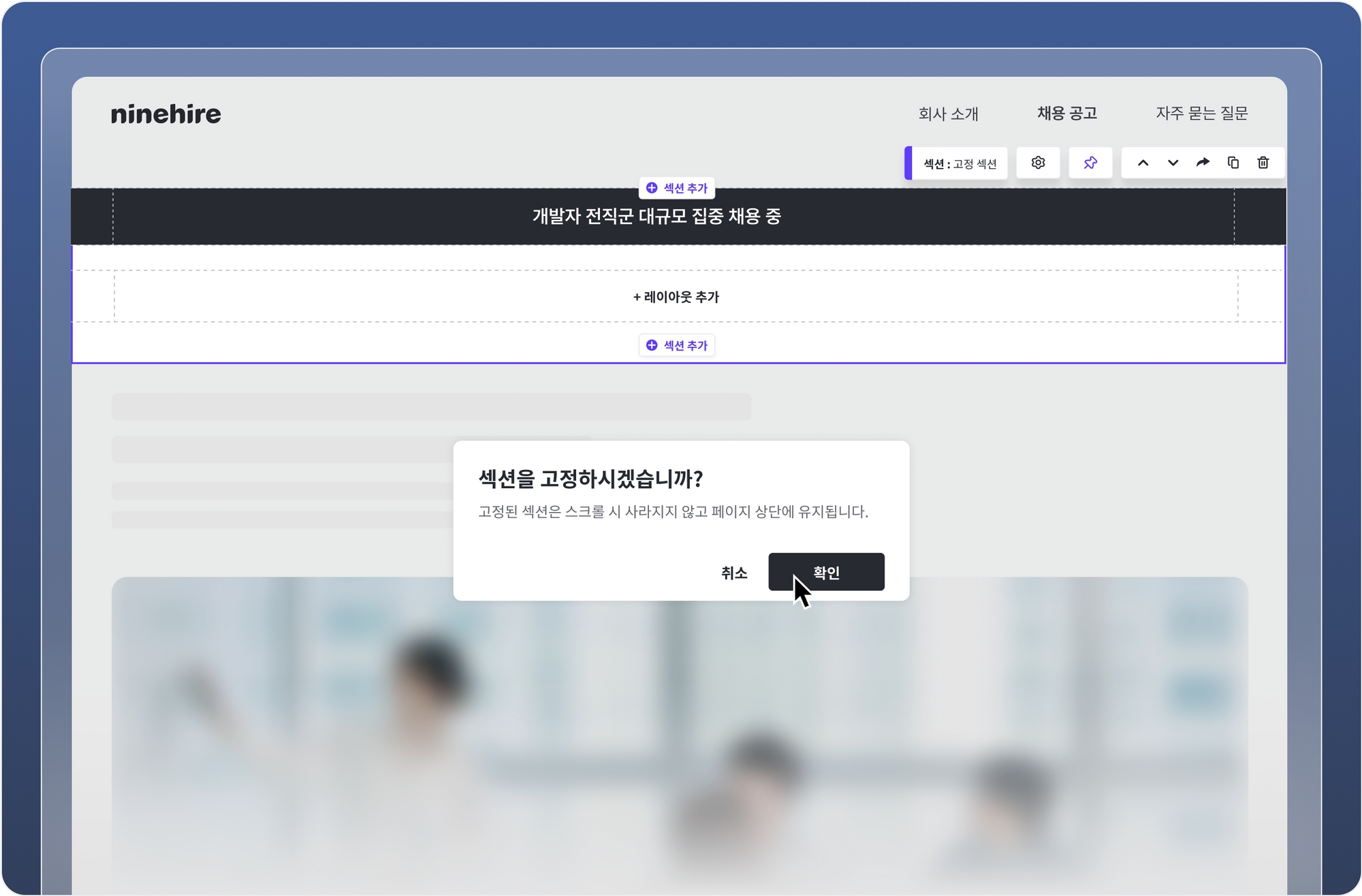 채용 홈페이지의 페이지별로 하나의 섹션의 위치를 고정할 수 있어요. 고정된 섹션은 스크롤 시 사라지지 않고 페이지 상단에 유지됩니다. 페이지에서 가장 강조하고 싶은 섹션을 고정하여 지원자에게 효과적으로 노출해 보세요.