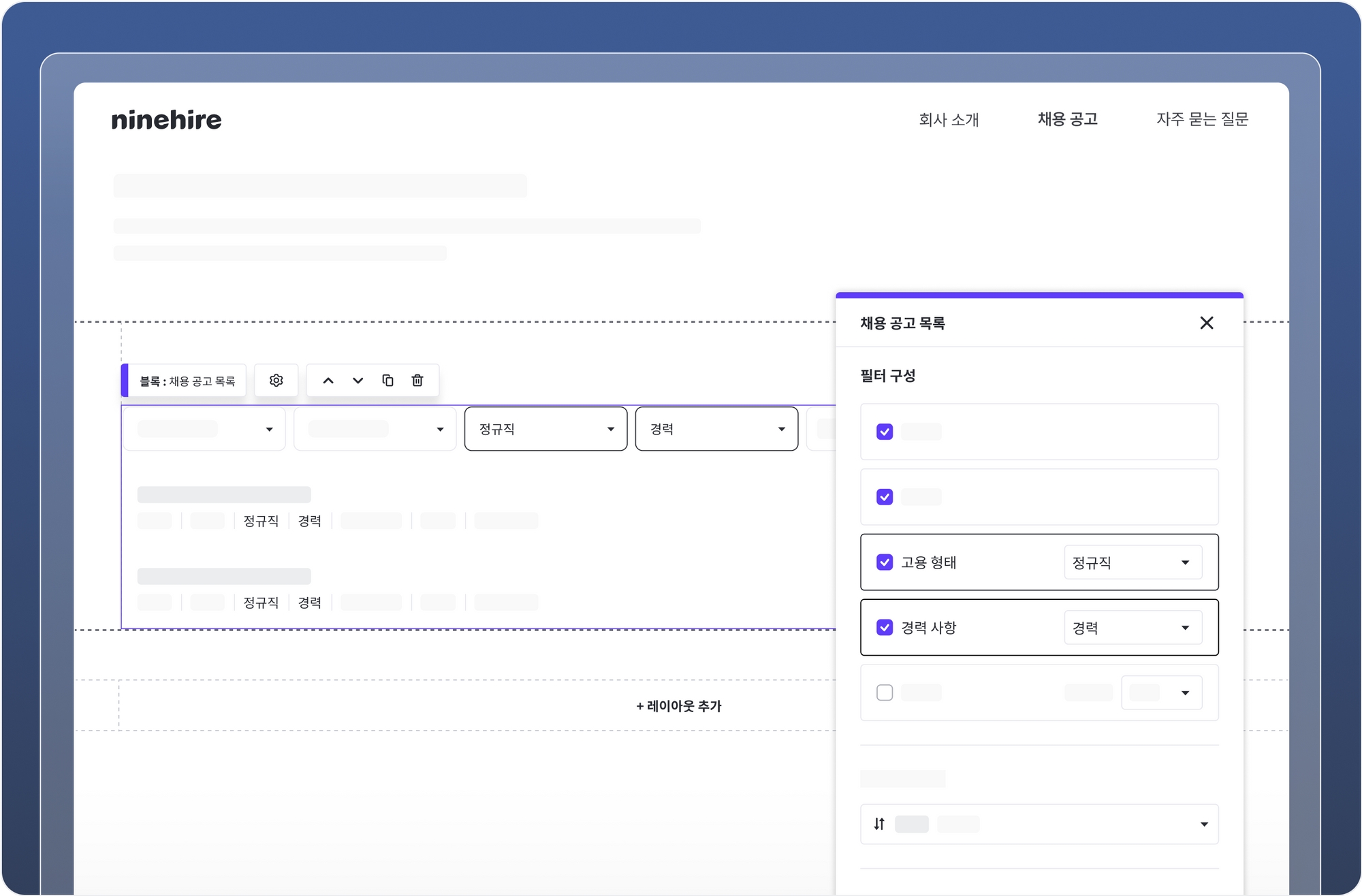지원자가 알고 싶고 지원하고 싶은 채용 공고를 채용 홈페이지에서 보다 빠르게 찾을 수 있도록 나인하이어 채용 홈페이지 빌더의 채용 공고 목록 블록이 개선되었어요.