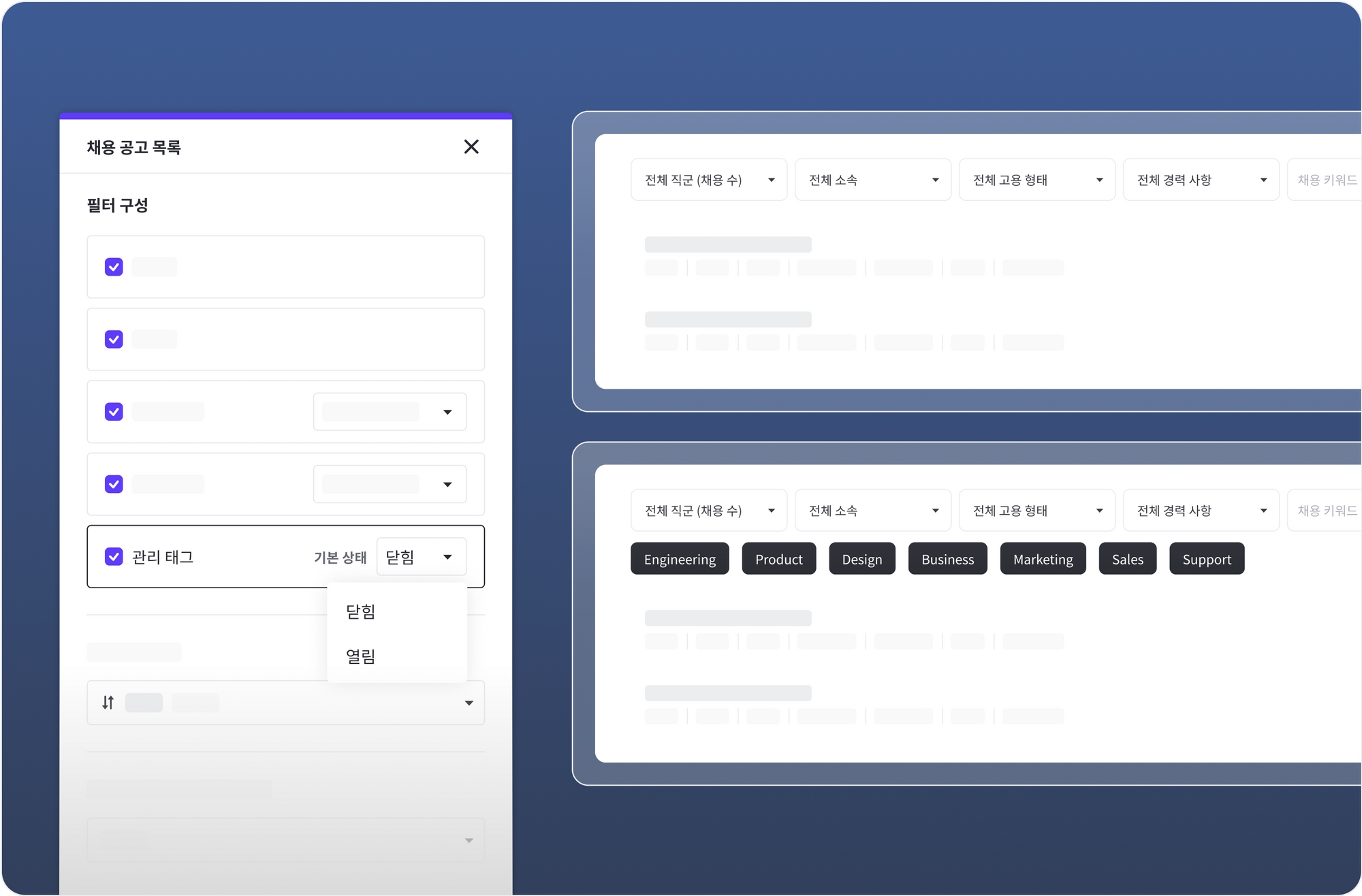 채용 공고 목록 관리 태그의 노출 여부를 설정할 수 있어요. 관리 태그의 기본 상태를 열림으로 설정하면 태그를 클릭할 필요없이 기본적으로 노출되며, 종료된 채용 공고의 관리 태그는 노출되지 않습니다.