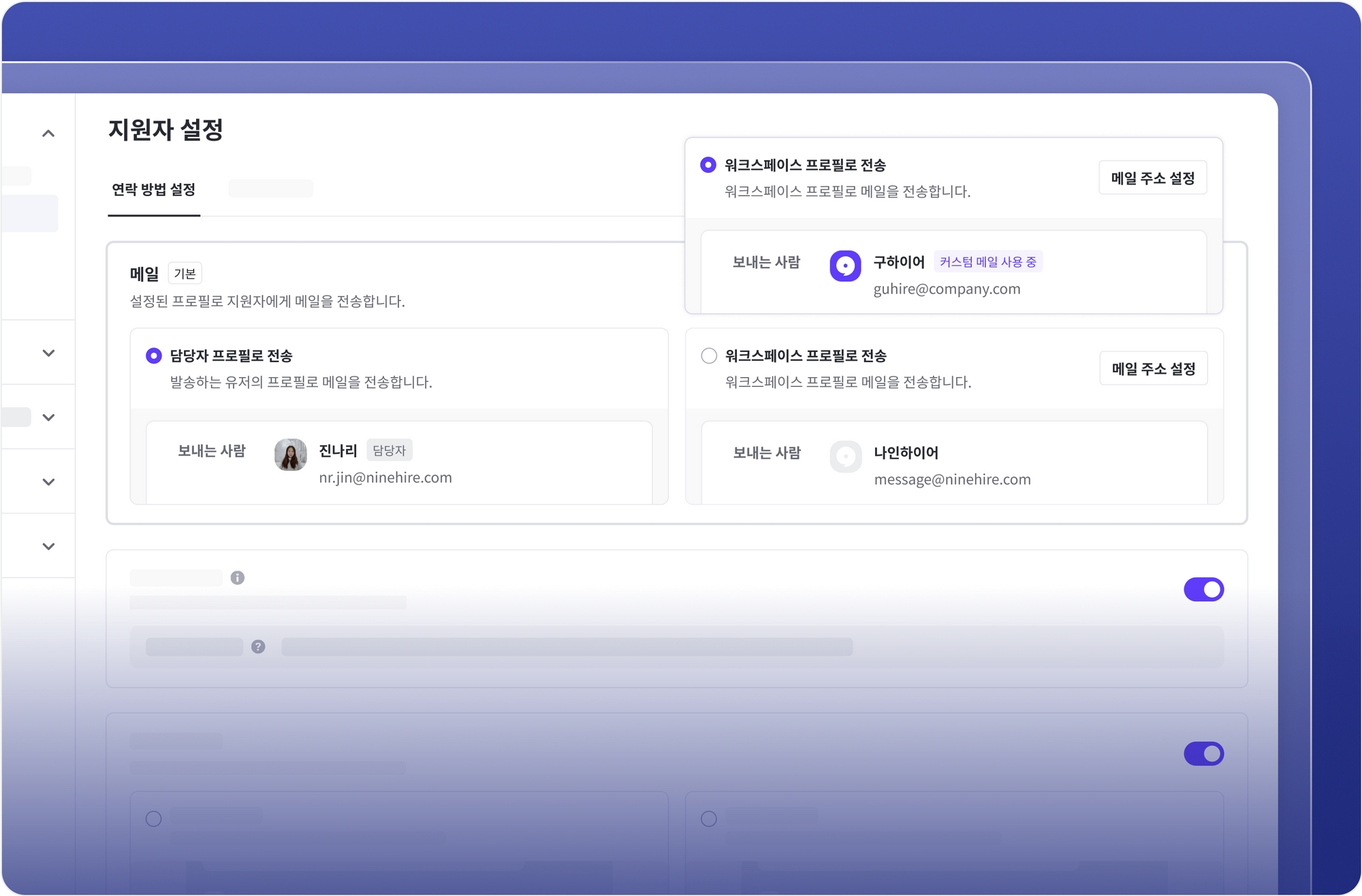 지원자에게 보낼 메일의 프로필을 담당자(메일을 발송하는 유저의 프로필) 혹은 워크스페이스로 설정할 수 있어요. 이때의 워크스페이스 프로필의 메일 주소를 커스텀할 수 있도록 개선되었습니다.(메일 주소를 커스텀하지 않았을 경우 발신자는 워크스페이스명으로 설정되나, 메일 주소는 message@ninehire.com으로 전송됩니다.)