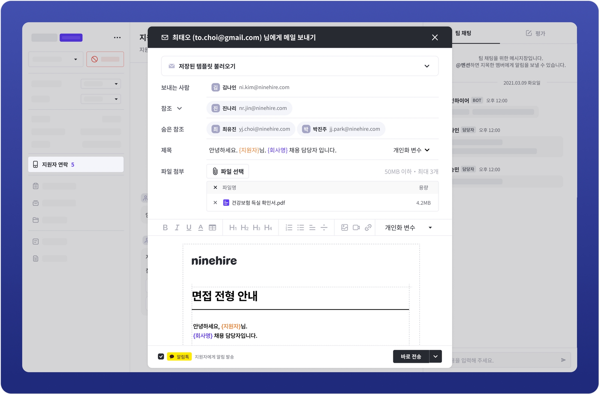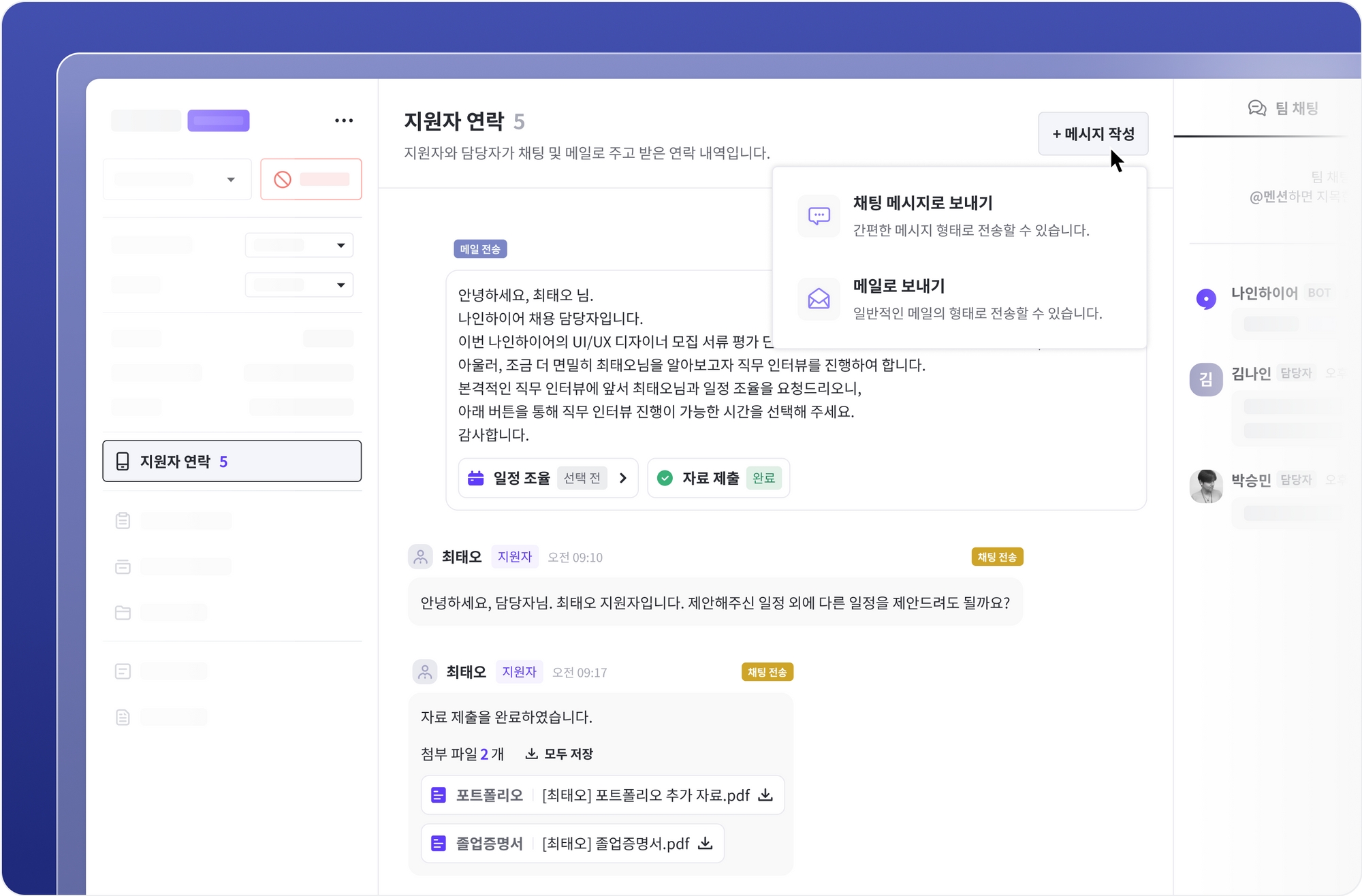 우리 회사의 채용 프로세스와 전략에 맞게 지원자 연락 방법을 선택해 보세요. 나인하이어는 간편한 메시지 형태인 [채팅 메시지로 보내기]와 일반적인 메일의 형태인 [메일로 보내기] 두 가지 전송 방식 제공합니다. 메시지 전송 방식에 상관없이 모든 연락 내역은 지원자 연락 탭에서 확인할 수 있어요.