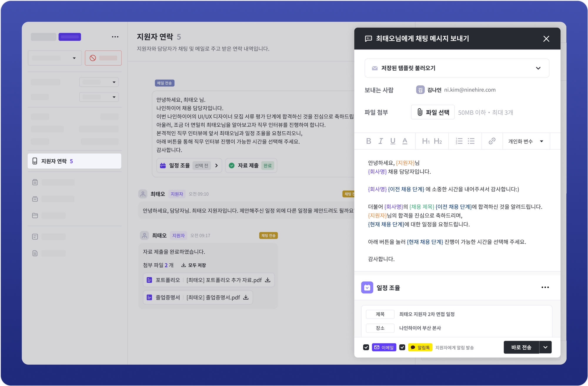 보내주신 의견을 적극적으로 반영하여 채팅 메시지와 메일을 상황별로 선택해서 지원자와 연락할 수 있도록 빠르게 개선하였습니다. 앞으로도 제품의 사용 경험을 높이기 위해 고객의 피드백을 빠르게 반영하는 나인하이어팀이 되도록 노력하겠습니다. 의견 주신 모든 분들께 감사드립니다.