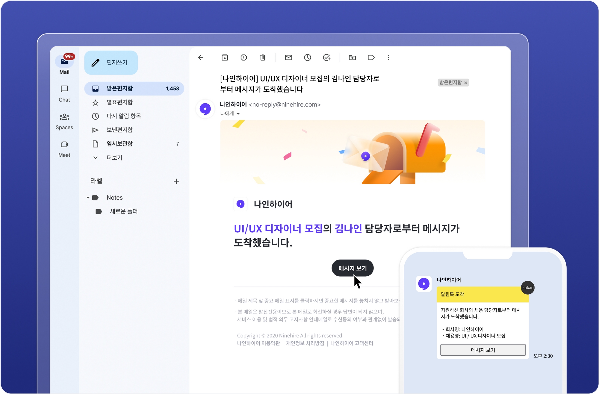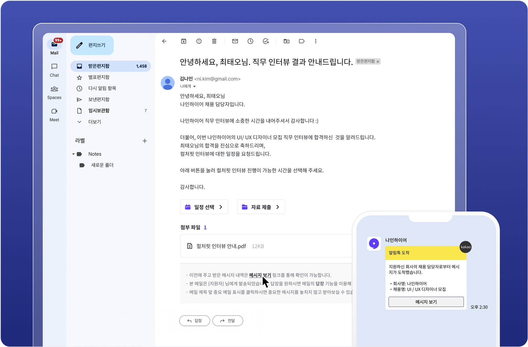 메일을 발송한 경우 지원자는 작성하신 메일과 알림 설정에 따라 카카오 알림톡을 수신합니다. 지원자는 메일을 통해 바로 회신할 수 있고, 메일과 카카오 알림톡의 [메시지 보기] 버튼을 통해 메시지창으로 이동하여 회신할 수도 있어요.