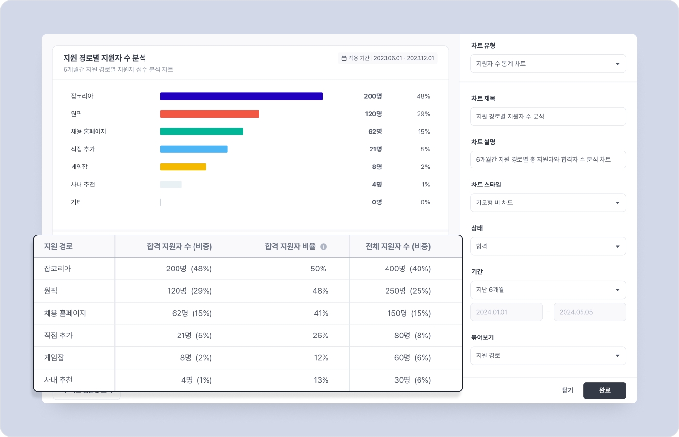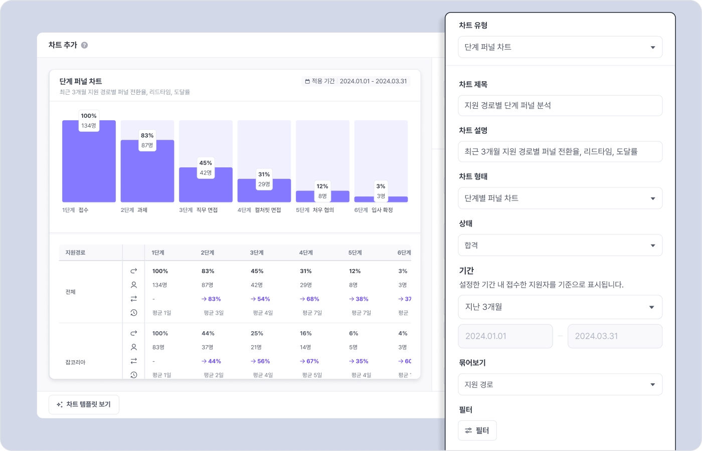 각 차트는 원하는 주제와 목적에 따라 제목, 설명, 차트 형태 를 자유롭게 설정하고, 지원자의 상태 (합격, 불합격, 현재의 단계)와 설정한 기간 동안 접수한 지원자를 기준으로 데이터를 표시할 수 있어요.