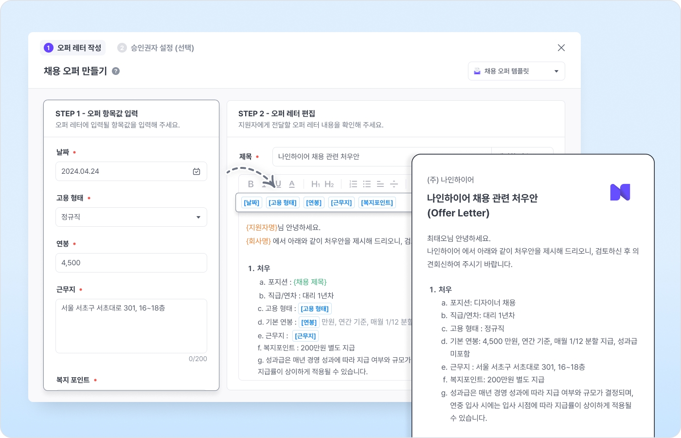 새롭게 제공되는 나인하이어의 채용 오퍼 기능을 활용하면 미리 설정된 템플릿 과 변수 를 기반으로 오퍼레터를 자동으로 작성하고, 지원자에게 빠르게 발송할 수 있습니다. 회사의 톤과 브랜딩에 맞게 템플릿을 지정하고 후보자의 정보를 자동으로 입력하여 수동으로 문서를 매번 만들 필요 없이 개인화된 오퍼레터를 간편하게 생성하고 지원자에게 발송해 보세요.