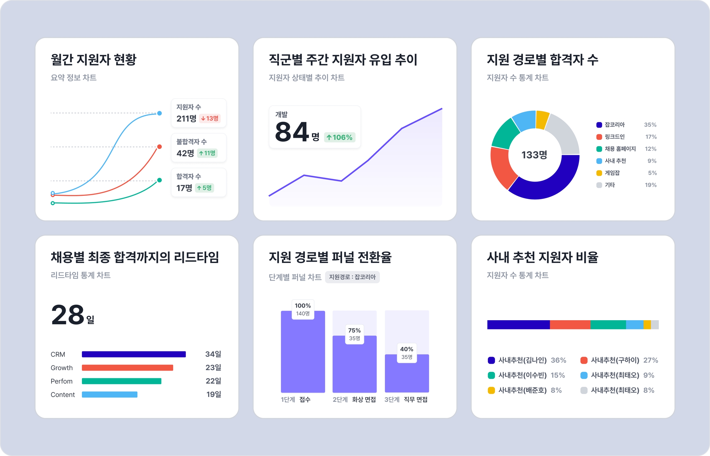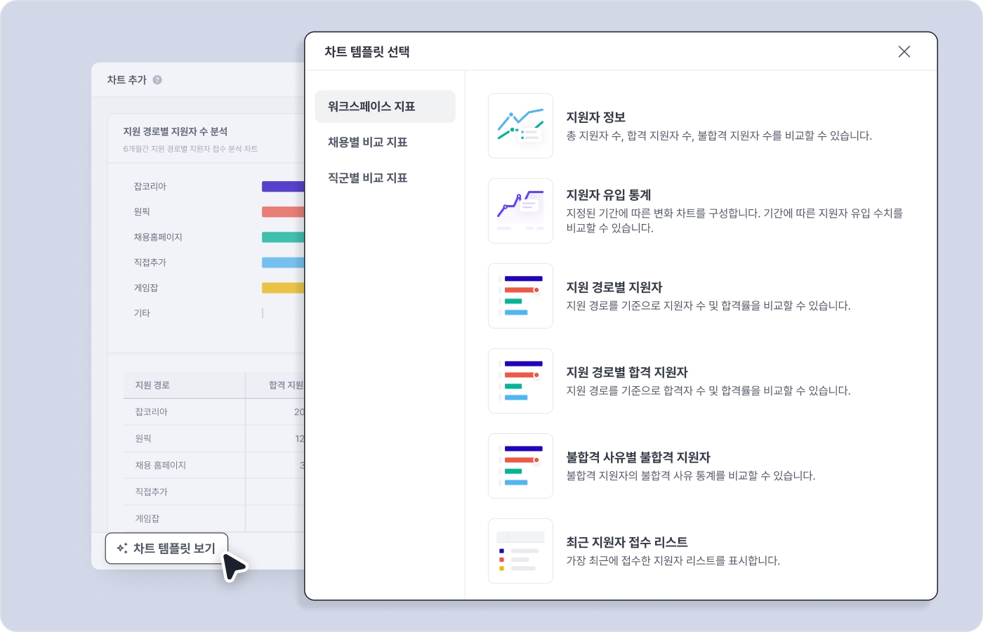 새롭게 개편된 리포트에서는 요약 정보 차트 , 지원자 상태별 추이 차트 , 지원자 수 통계 차트 , 리드타임 통계 차트 , 단계 퍼널 차트 , 지원자 리스트 차트 총 6가지 유형의 차트를 선택하여 커스텀할 수 있어요.
