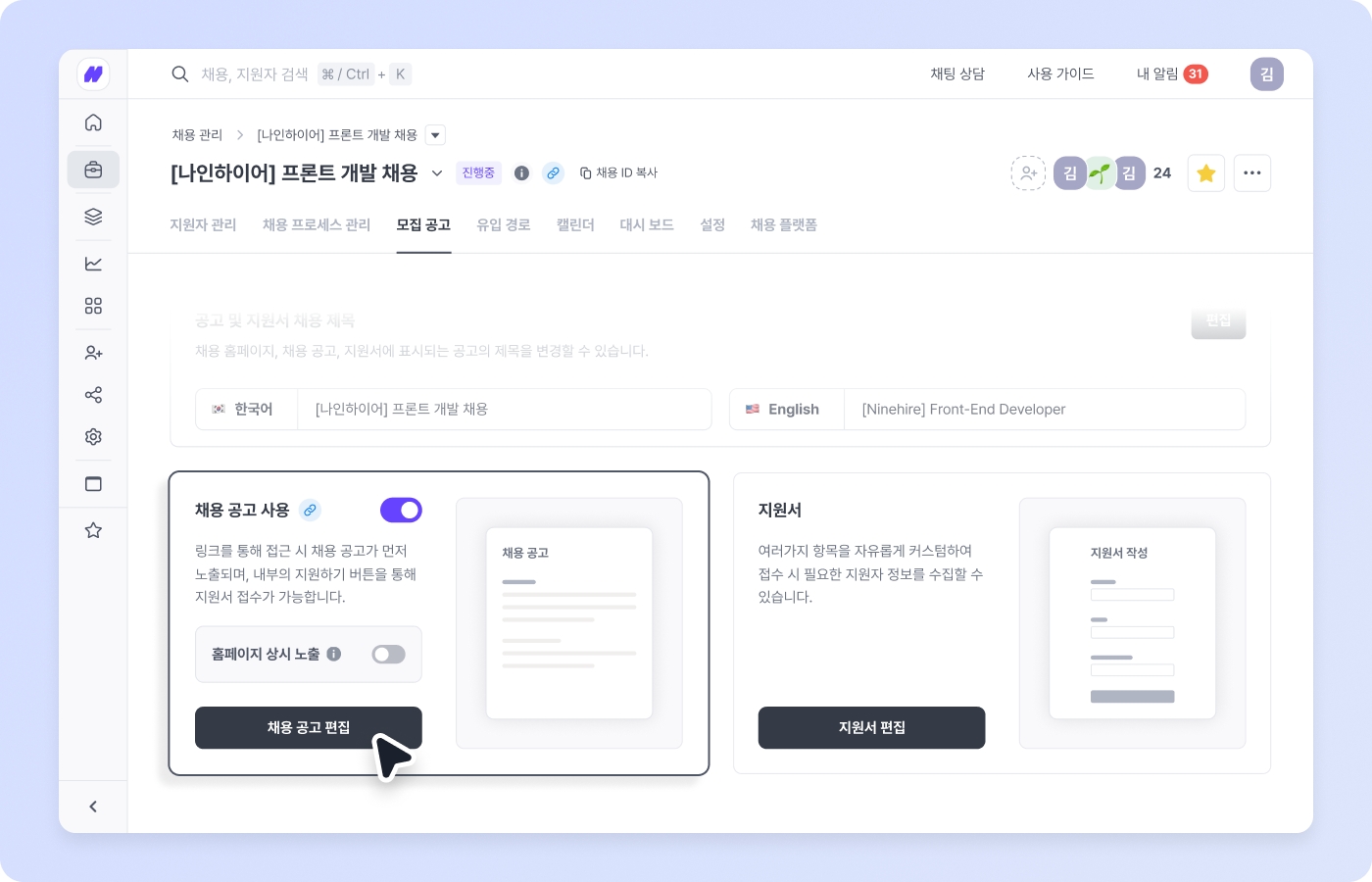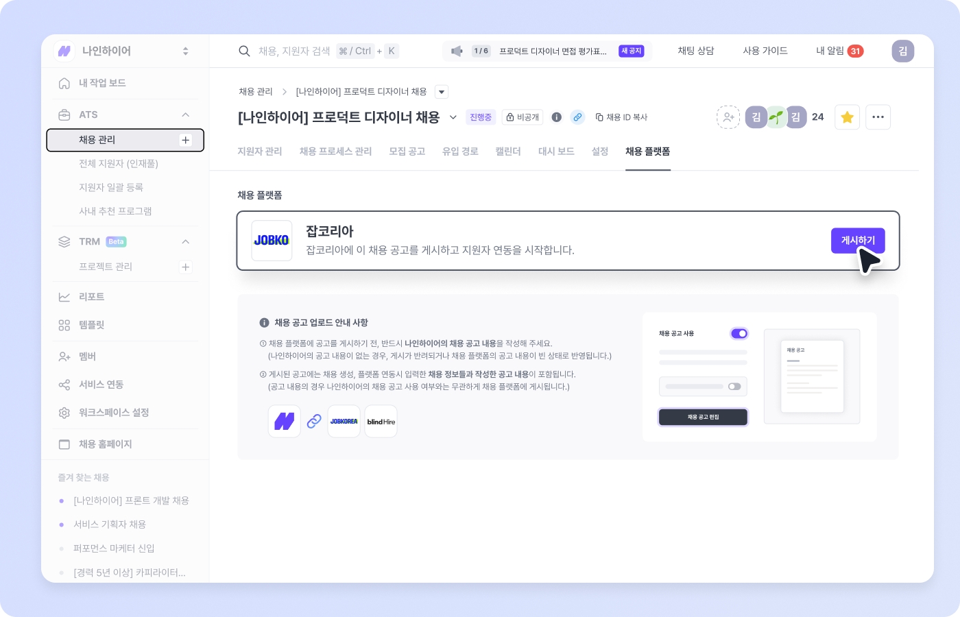 계정 연동이 완료되면, 나인하이어에서 잡코리아에 공고를 게시할 수 있어요. 공고를 게시하고자 하는 채용의 채용 플랫폼 탭으로 이동한 후, 게시하기 버튼을 클릭하면 해당 공고가 자동으로 잡코리아에 게시됩니다.