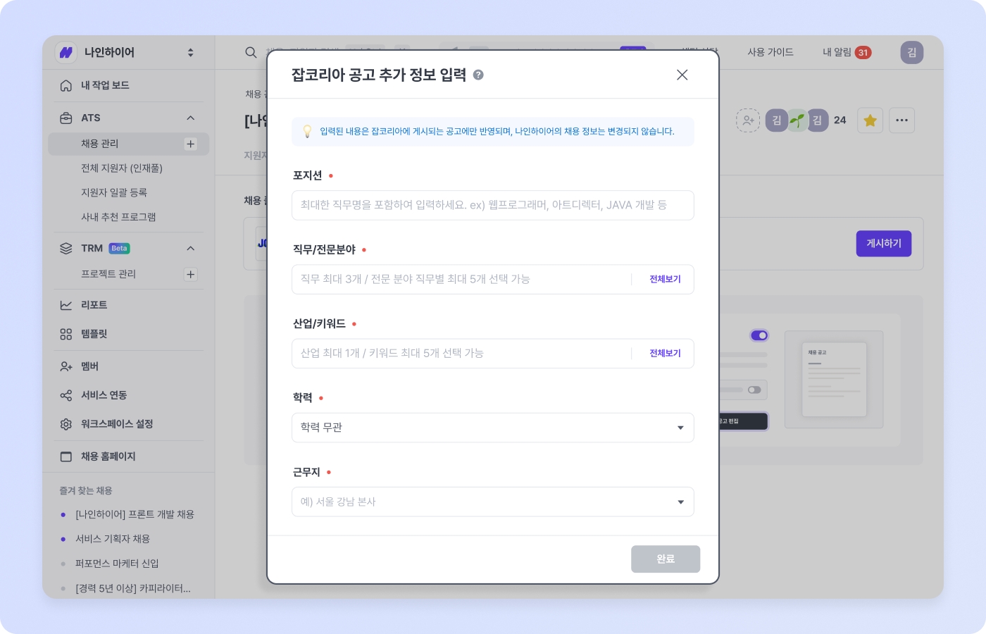 잡코리아에 공고를 게시하기 전에, 나인하이어에서 공고 내용을 모두 작성했는지 확인해 주세요. 만약 공고 내용이 작성되지 않은 경우, 게시가 반려되거나 내용이 없는 상태로 잡코리아에 반영될 수 있습니다.