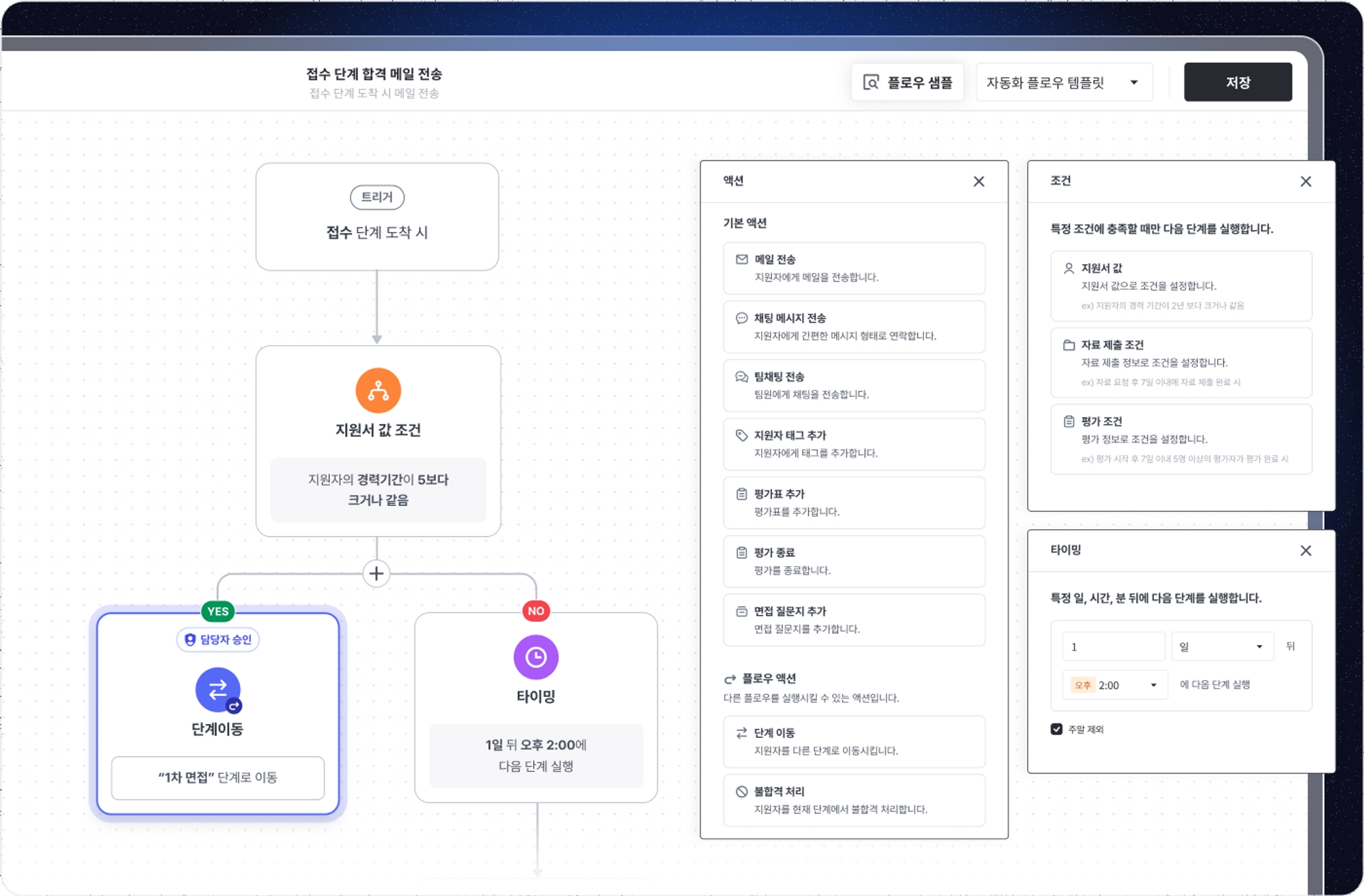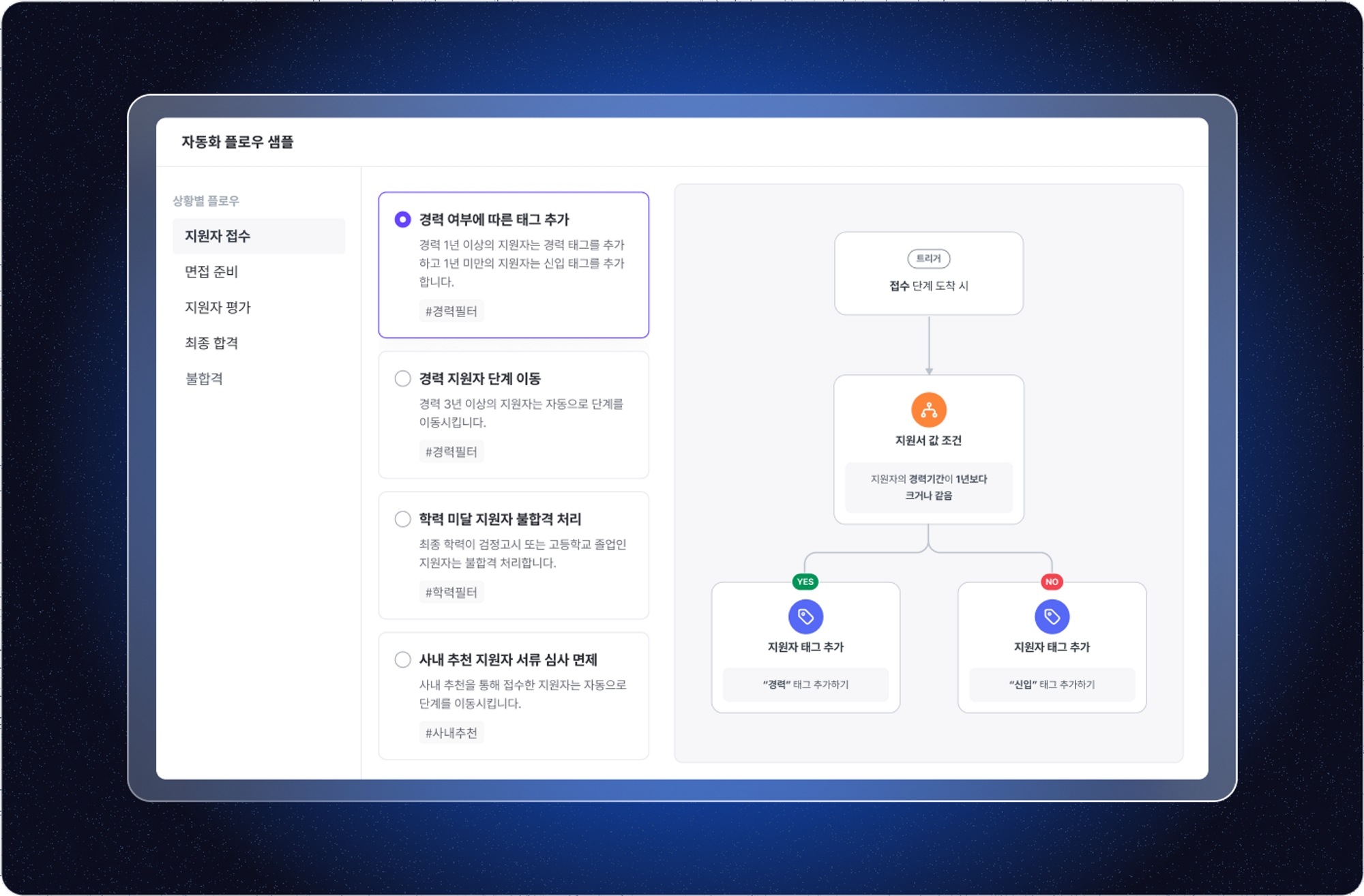 지원서의 응답 내용에 따라 자동으로 단계를 이동시키거나 태그를 추가할 수 있으며, 평가 결과(점수 또는 찬반)에 따라 원하는 후속 액션을 설정할 수도 있습니다. 또한, 채용 단계에 따라 다양한 샘플들이 준비되어 있으니 이를 활용하여 손쉽게 자동화 플로우를 구성해 보세요.