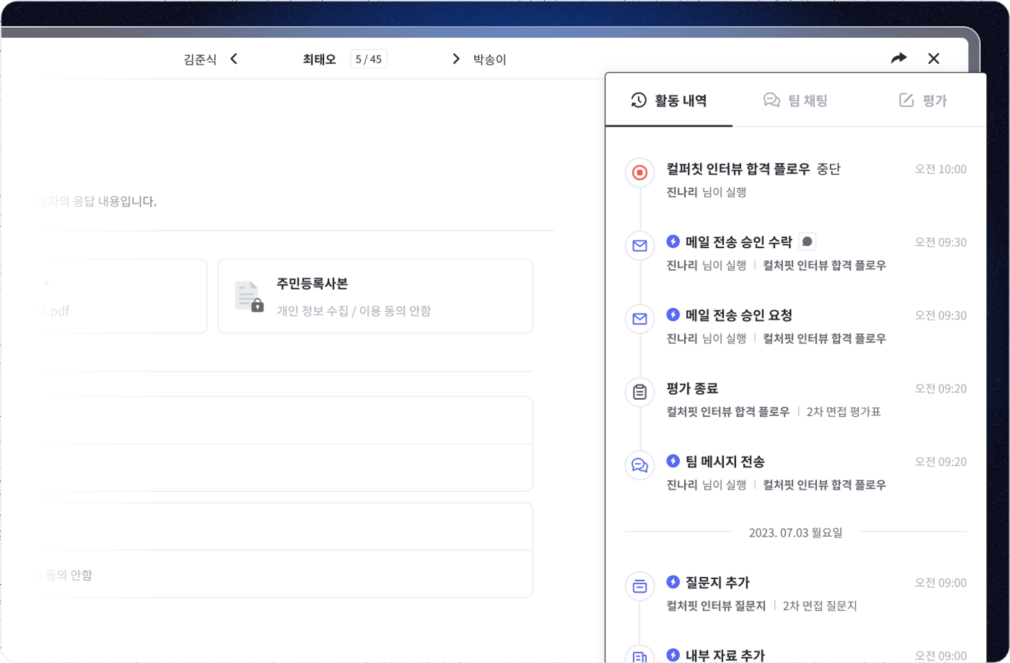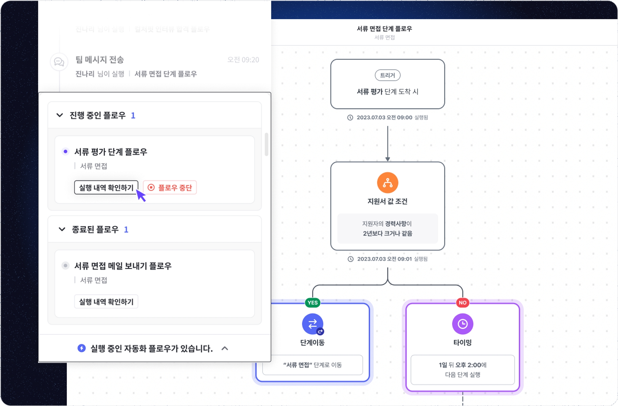 지원자에게 자동화된 작업이 원활히 진행되고 있는지 신속하게 파악할 수 있습니다. 지원자 상세 화면의 활동 내역에서 실시간으로 지원자에게 실행된 자동화 액션들을 확인해 보실 수 있으며, 자동화 플로우를 통해 실행된 액션들 뿐만 아니라 지원자에 대한 모든 내역이 기록되어 있습니다. 또한, 지원자에게 현재 진행 중인 플로우 내역과 플로우별 현재 진행 상황도 함께 확인할 수 있습니다.