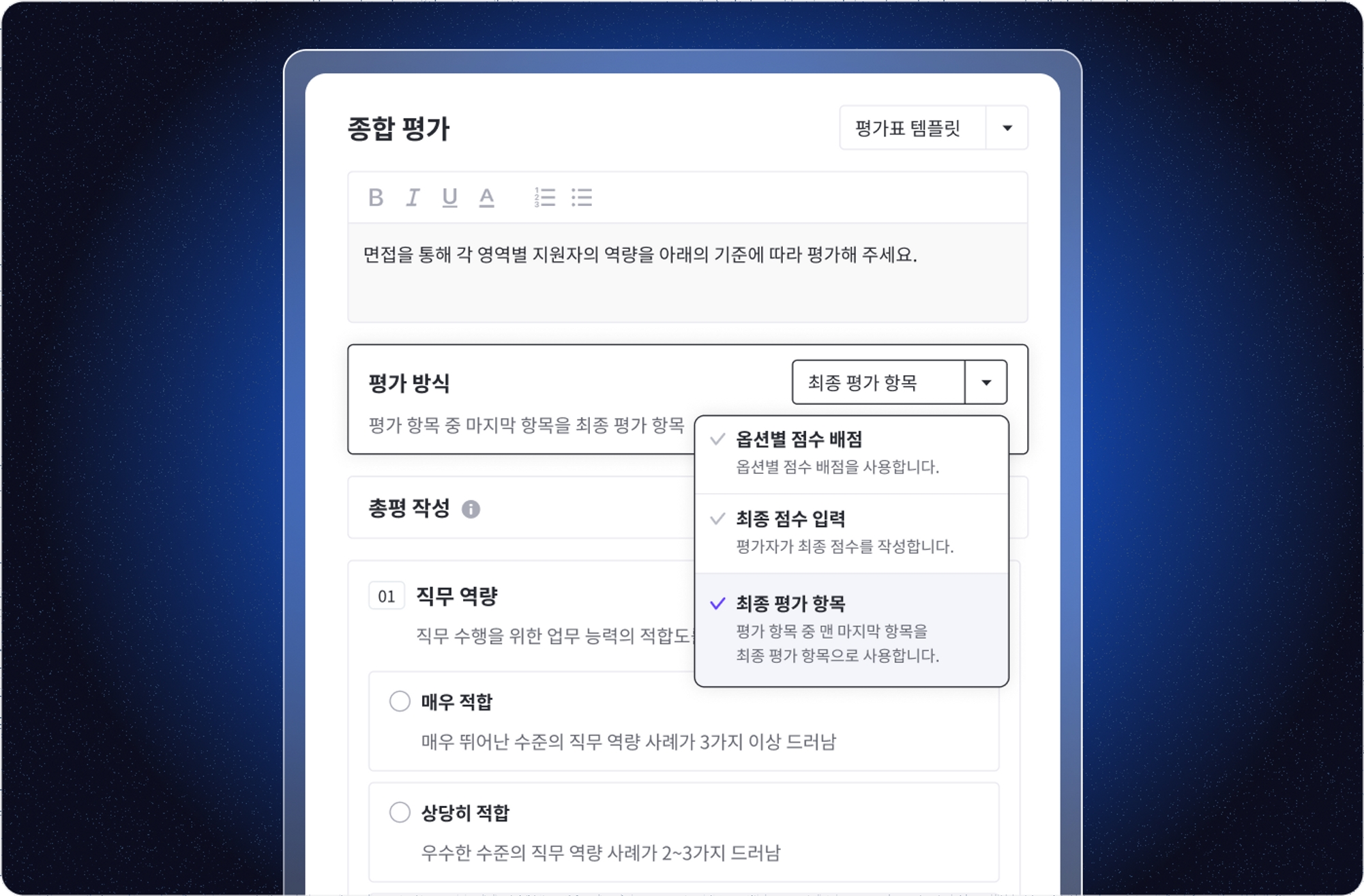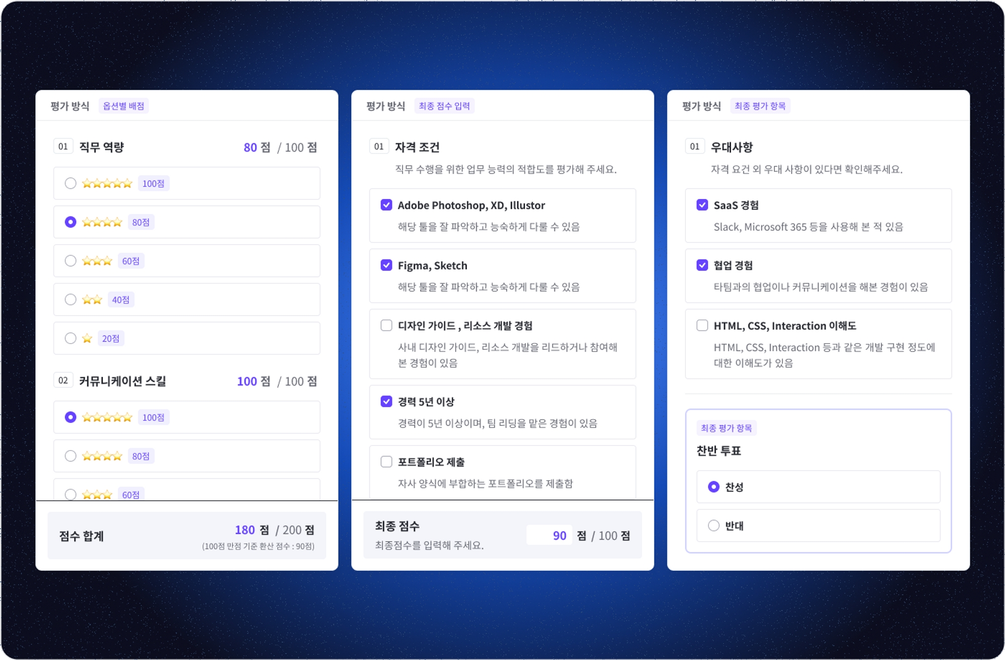 옵션별 점수 배점 : 각 평가 기준마다 점수를 할당하여 평가자가 선택한 기준에 따라 최종 점수를 자동으로 계산됩니다.