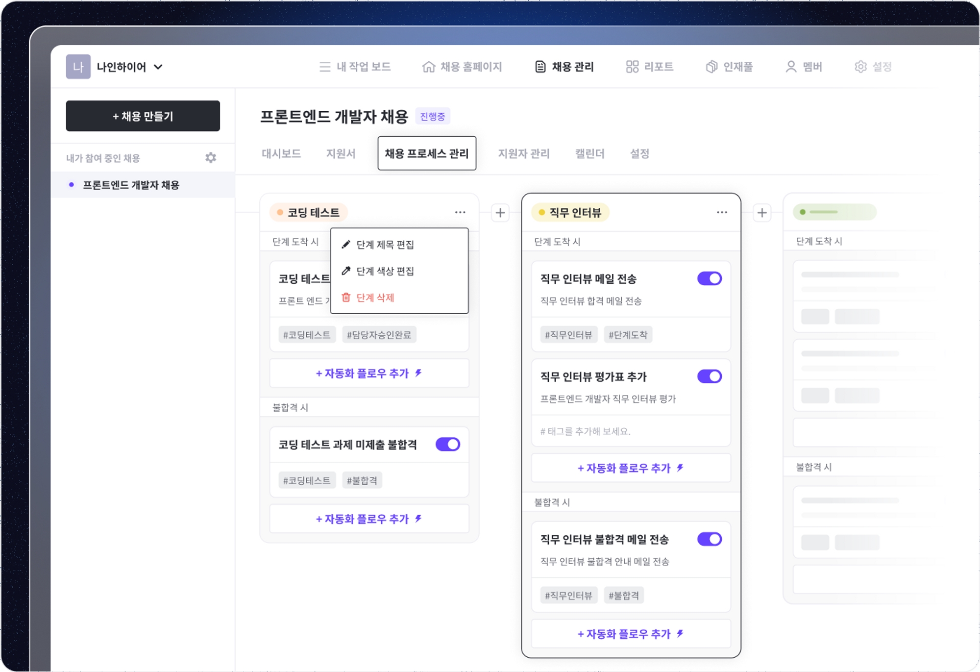 이제는 단일 액션의 자동화를 넘어서, 조건에 따라 정확한 타이밍에 다양한 액션을 자동으로 처리할 수 있습니다. 모든 채용 프로세스를 원하는 대로 자유롭게 조정하고 효과적으로 관리하여 채용 오퍼레이션의 효율을 크게 향상시켜 보세요.